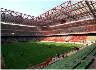 圣西罗球场举行的第一场比赛是1926年9月19日的米兰德比,国际米兰以6-3击败AC米兰。 1935年,AC米兰把球场卖给了当地政府,政府新建了第二层的看台,座位数扩大到了60,000个。1957年时又加装了照明设备,供夜间举行比赛使用,而电子记分板则是10年以后设置的。 1980年,这座“足球殿堂”正式以吉尤斯佩-梅阿查(Giuseppe Meazza)的名字命名,以纪念这位前国际米兰和意大利国家队的传奇球星。 梅阿查球场最近一次改建是在1990年,看台加高到了三层,赶在1990年意大利世界杯前完工,总座位数增加到82955个。 看台的每一层都分为四个区,用四种不同颜色标出,长方形看台部分是橙色和红色,转角部分是绿色和蓝色。惟一例外的是第三层的最顶层,那里没有橙色区。 自2002/03赛季起,球场被分为东南西北四个区 |